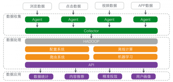 数据处理:数据通过Flume汇聚会最终保存在Hadoop上,首先我们会对数据进行清洗,清洗的目的一个是将日志中所需要的字段提取出来,做结构化处理,另外一个目的是去掉脏数据。对于清洗后的数据,我们会按照统计业务的需求对数据计算,并生成计算结果提供给统计业务进行查询,另外我们还会对这些数据进行挖掘,分析用户的喜好、兴趣点等特征。